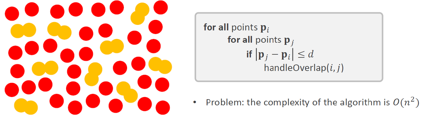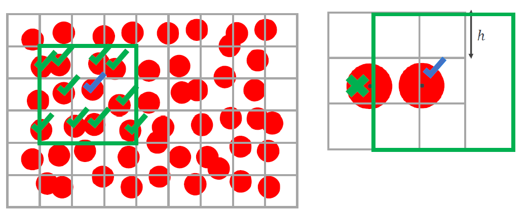아래와 같이 그리드를 이용해 각 정점을 cell에 포함시키고, 인접한 cell에 포함된 정점만을 조사한다면 일정 거리 내에 있는 정점들을 찾을 수 있다.