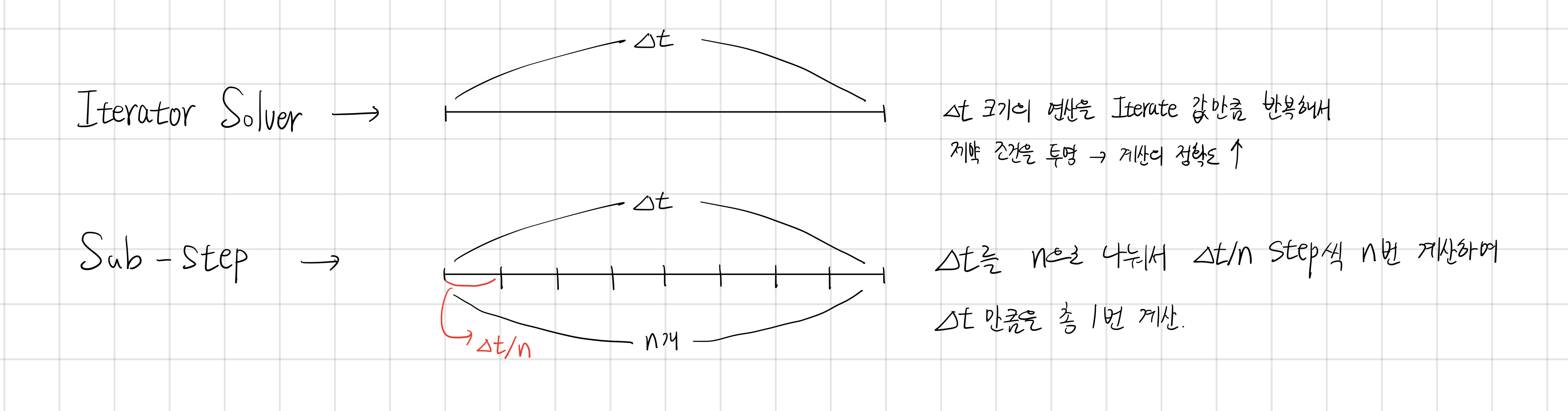 정점 간의 충돌을 놓치지 않기 위해 CCD(Continuous Collision Detection)나 Iterator Solver에 의한 반복 연산이 아닌, Sub-Step 방식을 사용한다.