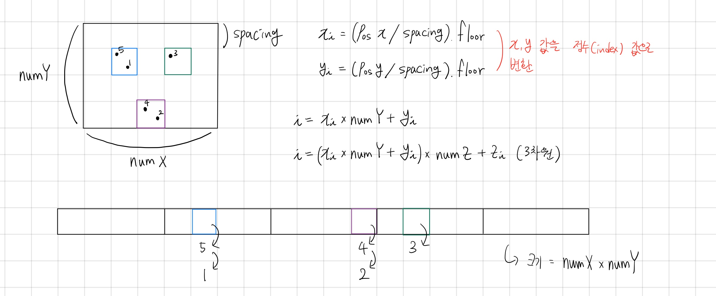 그리드 한 칸의 길이를 spacing이라 하면, 각 정점 위치를 이용하여 배열의 index를 계산할 수 있다. 이를 이용해 각 배열 index에 해당 정점의 index를 대입한다.