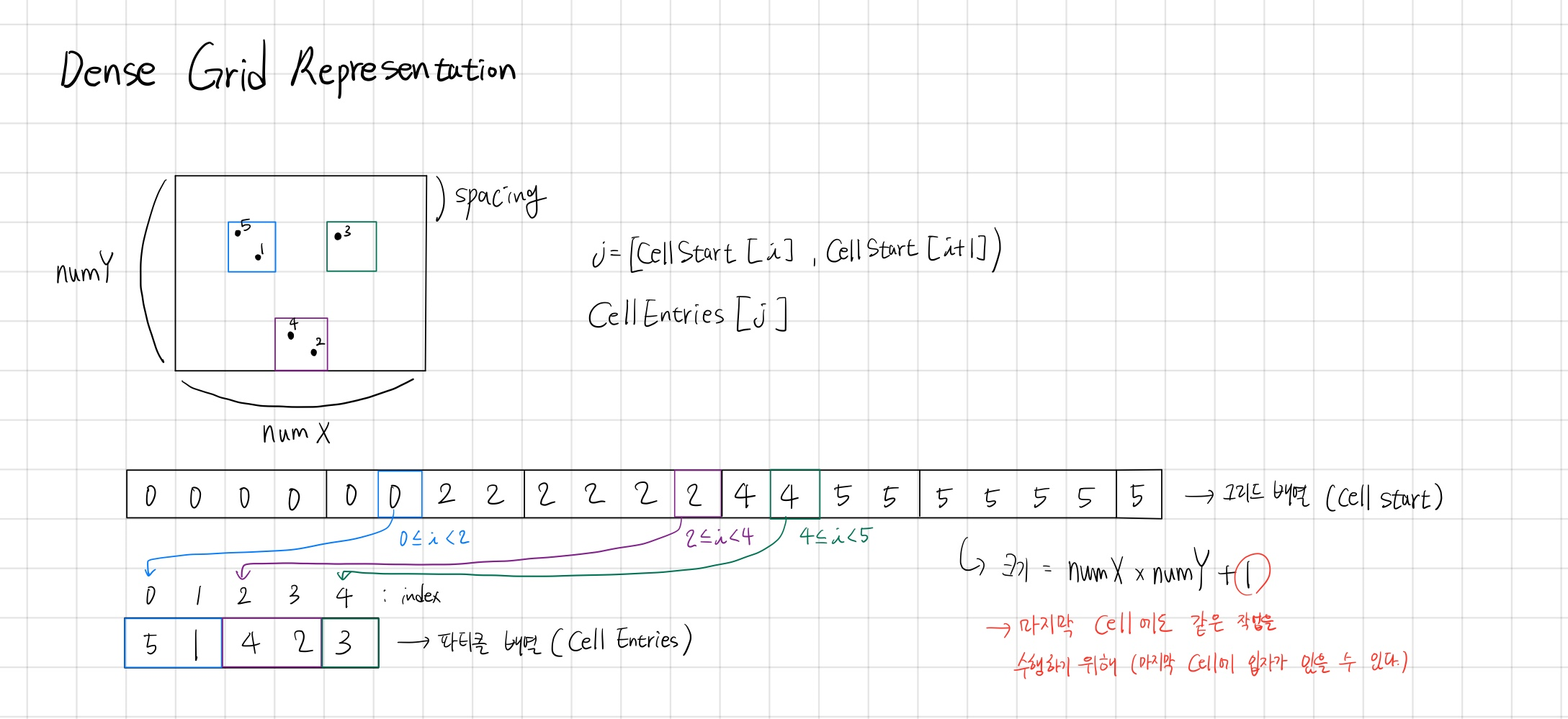 ➡️ 이때, 그리드 배열의 원소는 해당 cell의 첫 번째 입자가 파티클 배열의 어느 위치에 있는지를 나타낸다.