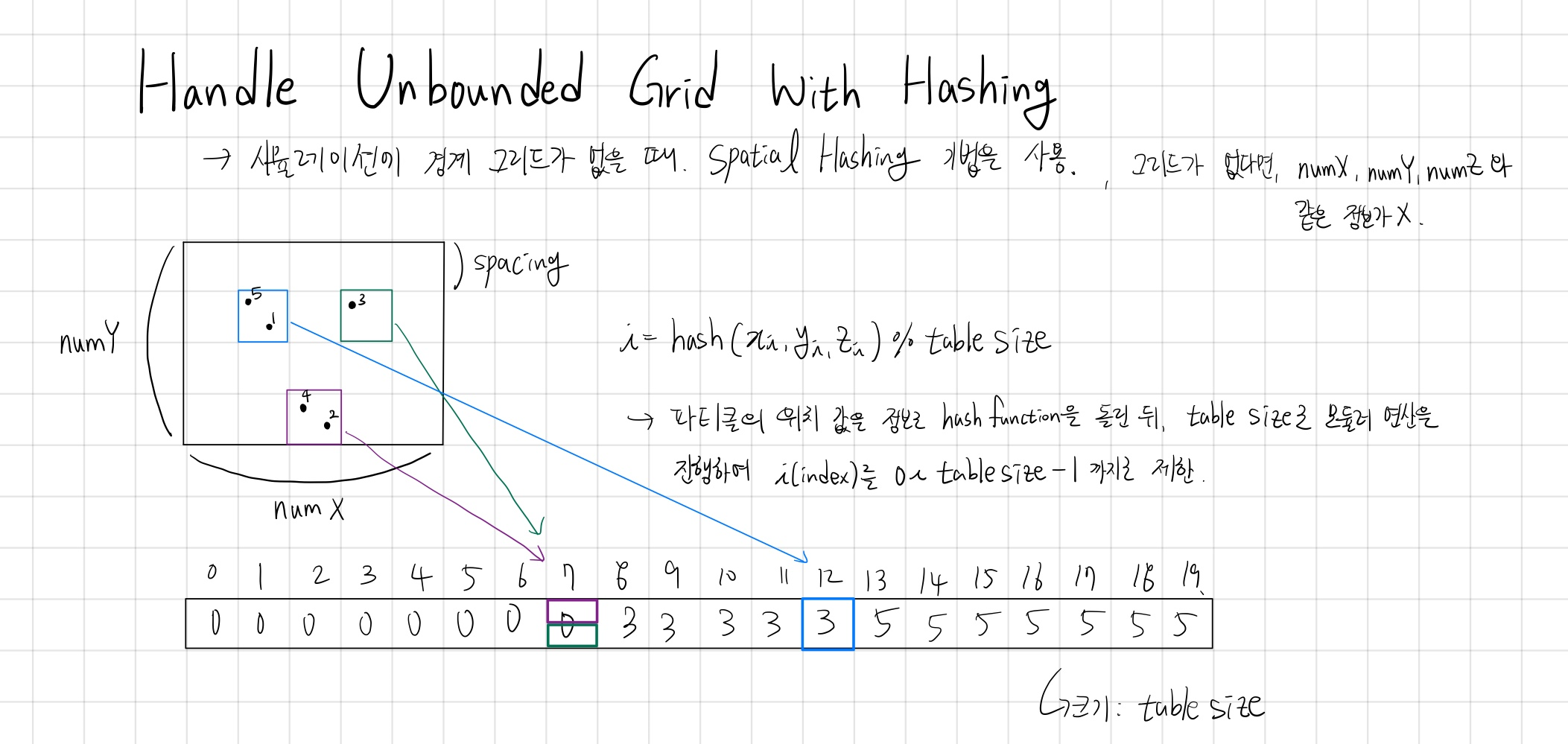 ✅ 시뮬레이션에 경계 그리드가 포함되지 않은 경우에는 Spatial Hashing 기법을 사용한다. 이는 정점의 위치 값을 정보로 hash 함수를 통해 index를 얻은 뒤, 이를 배열에 할당하는 방식이다.