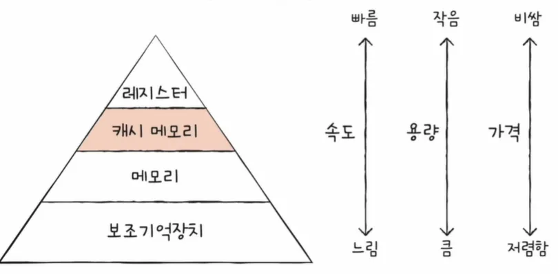 이 중에서 캐시 메모리는 CPU와 메모리(RAM) 사이에 위치한 레지스터보다 용량이 크고 메모리보다 빠른 SRAM 기반의 저장 장치이다. 이중에서도 코어와 가장 가까운 캐시 메모리를 L1(level 1) 캐시, 그다음 가까운 캐시 메모리를 L2 캐시, 다음은 L3 캐시라고 부른다. 일반적으로 L1 캐시와 L2 캐시는 코어 내부에 있으며 L3 캐시는 코어 외부에 위치해 있다.