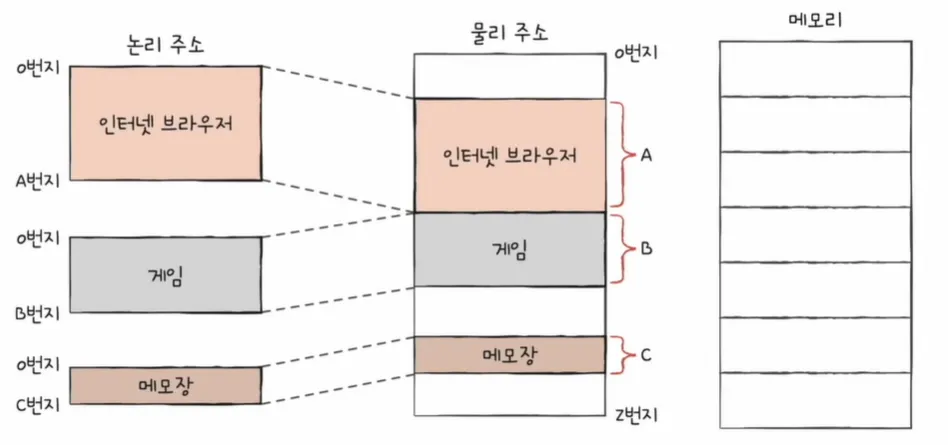 주소에는 크게 물리 주소와 논리 주소가 있다. 물리 주소는 정보가 실제로 저장된 하드웨어상의 주소를 의미하며, 논리 주소는 실행 중인 프로그램에게 각각 부여된 0번지부터 시작되는 주소를 의미한다.