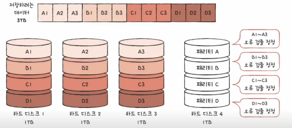 이러한 방식에는 데이터를 각 하드디스크로부터 동시에 읽어올 수 있기 때문에 읽기/쓰기 속도가 빨라지지만 하드 디스크 하나에만 문제가 생겨도 모든 데이터의 정보를 읽지 못한다는 안정성 문제가 있다.