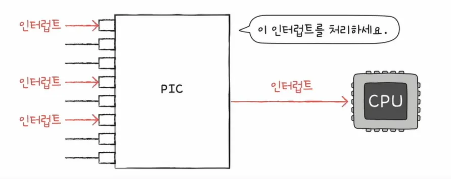 또한, PIC(Programmable Interrupt Controller)라는 하드웨어를 활용해 여러 장치 컨트롤러부터 오는 인터럽트의 우선순위를 판별하여 지금 처리할 인터럽트를 반환하는 방법도 있다. PIC는 NMI가 발생했을 경우 우선순위를 판별하지 않고 가장 먼저 처리하게 되며, PIC를 계층적으로 사용하여 훨씬 더 많은 하드웨어 인터럽트를 관리할 수도 있다.
