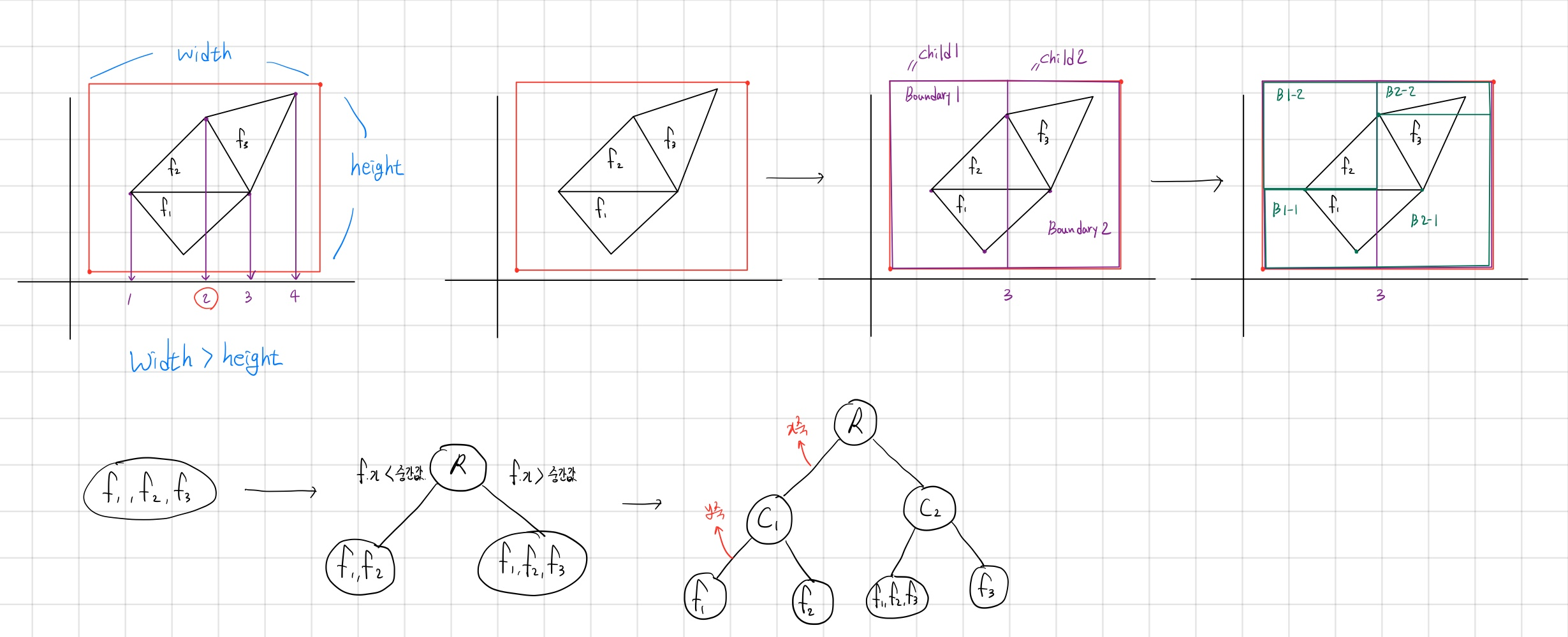 - 해당 노드 boundary의 가장 긴 축을 기준으로 boundary에 포함된 정점들을 투영 및 정렬한다.