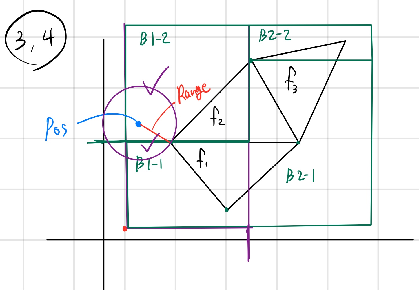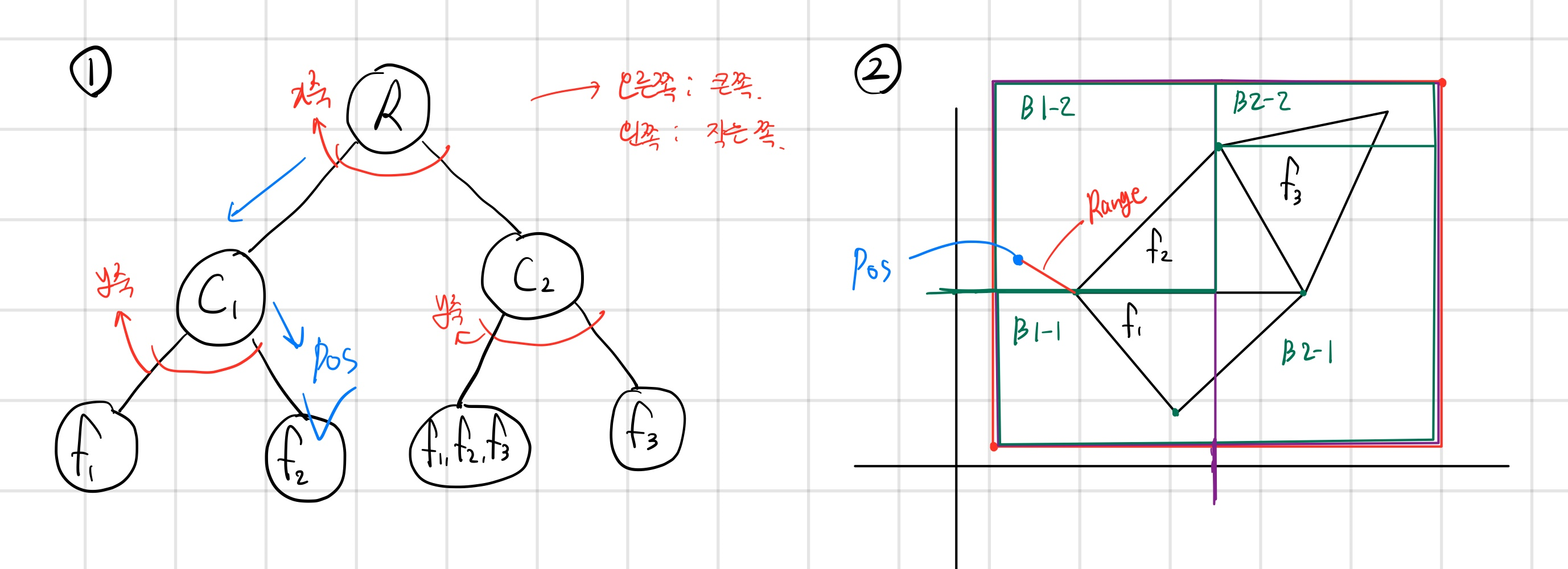 임의의 점 pos에서, 트리 순회를 통해 B1-2라는 노드에 속한 것을 확인한다.