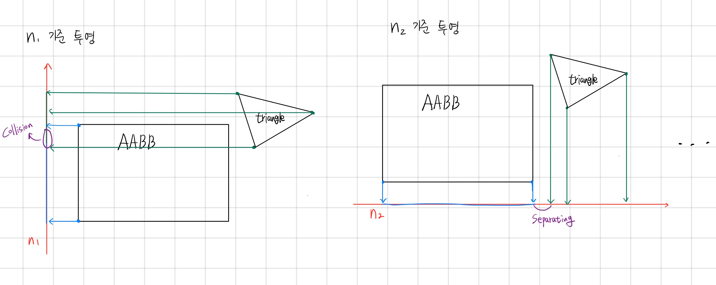 아래와 같은 AABB와 삼각형 메시를 기준으로 {AABB의 edge(=3) * 삼각형 메시의 edge(=3)} + {AABB의 법선 벡터(=3) + 삼각형 메시의 법선 벡터(=1)} = 13으로 총 13번의 계산(투영)이 필요하다.