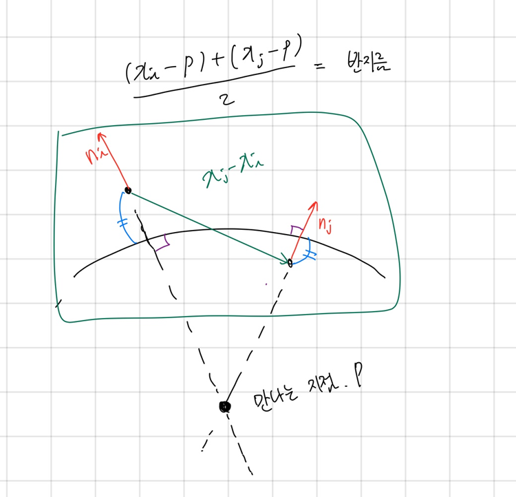 먼저, 법선 벡터와 $x_j - x_i$가 포함된 평면 위의 각 점 $i, \ j$에 같은 거리에 있고, 각 법선 벡터에 수직인 원을 찾는다: