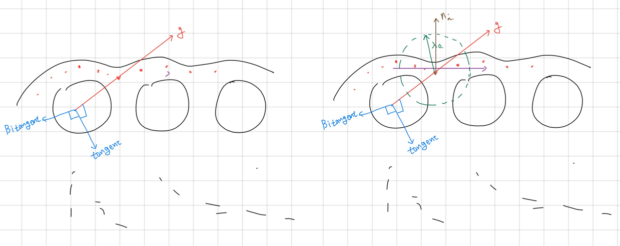앞서, 메타볼 레벨셋을 활용해 계산한 $\nabla\phi$를 활용해 tangent와 bitangent를 계산한다. 이후, 해당 좌표계에 대한 $\lambda_c$ 반경 내부 이웃의 최소제곱평면을 활용한다: