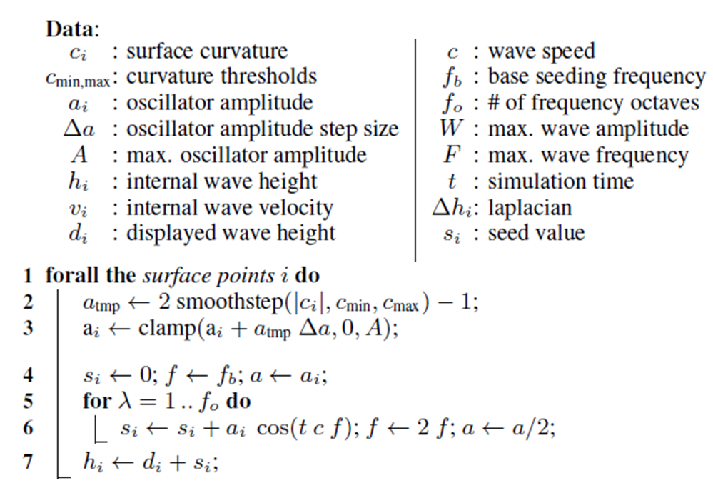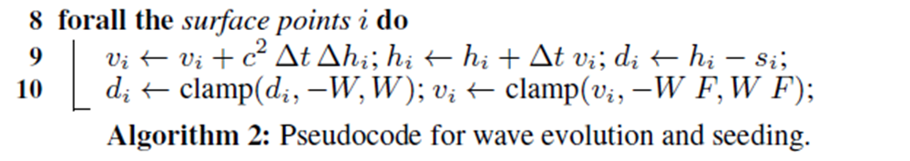 $h$를 파동 방정식을 통해 전파 시킨 뒤, $s$ 값을 빼서 실제 보이는 파동의 높이 $d = h-s$를 계산하여 더욱 역동적인 파동을 표현한다.