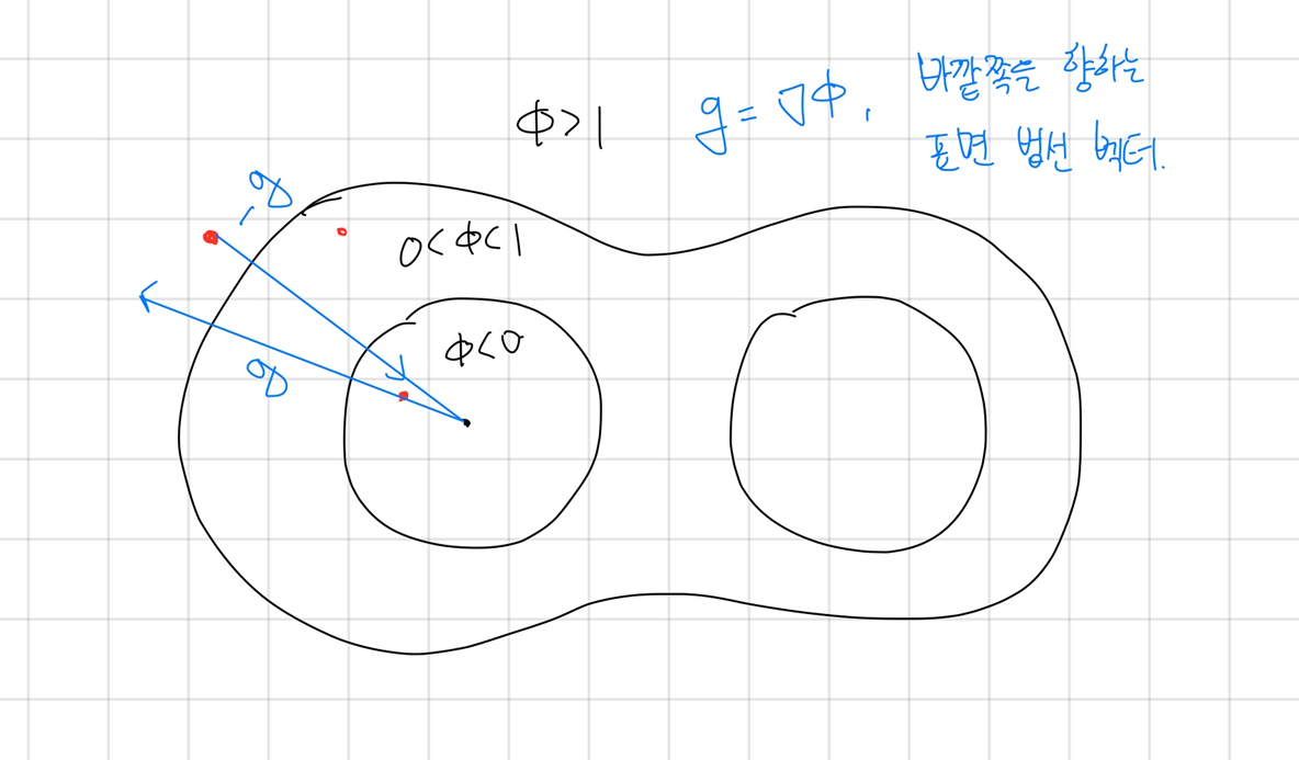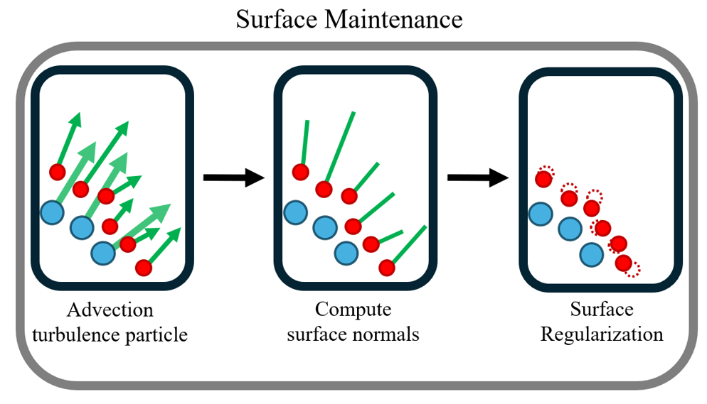 이때, 메타볼(Metaball) 레벨셋을 활용하여 법선 벡터(Gradient)를 계산하고 제약조건 투영을 활용해 coarse-scale 입자 주변에 위치가 유지되도록 한다: