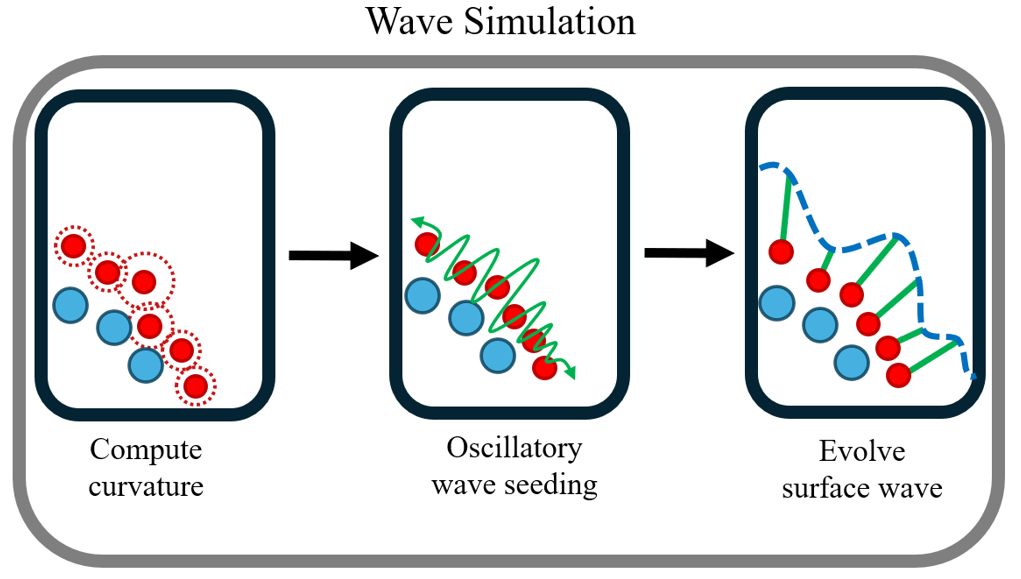 파동은 곡률이 높은 입자로부터 코사인 파동 생성을 시작하며, 불안정한 지점에서는 파동을 제한하고, 다양한 주파수를 중첩하여 복합적인 파형을 생성한다.