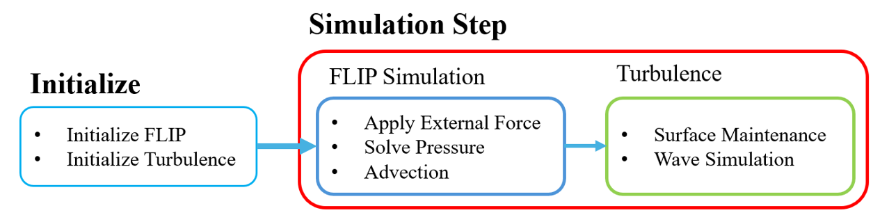 기존의 유체 시뮬레이션은 표면에서의 파동 표현이 자세하게 표현되지 않는다. 따라서 FLIP 기법에 추가적인 시각적 세부 표현을 더하기 위해 파동 난류 표현을 진행한다.