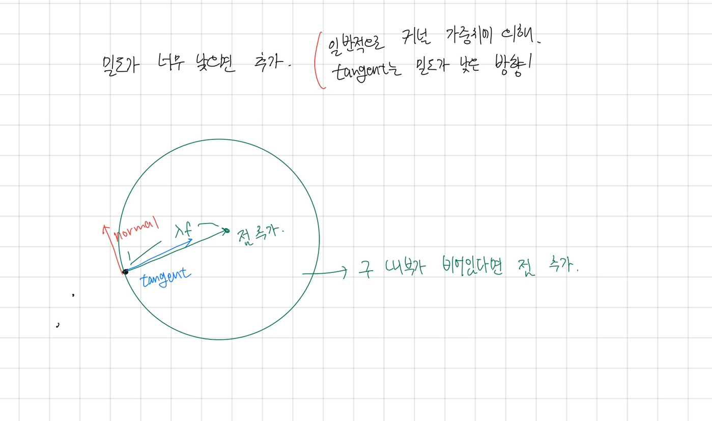 fine-scale 입자의 밀도를 유지하기 위해 탄젠트 방향 정규화를 진행한다. 이는 다음 공식에 따라 수행된다: