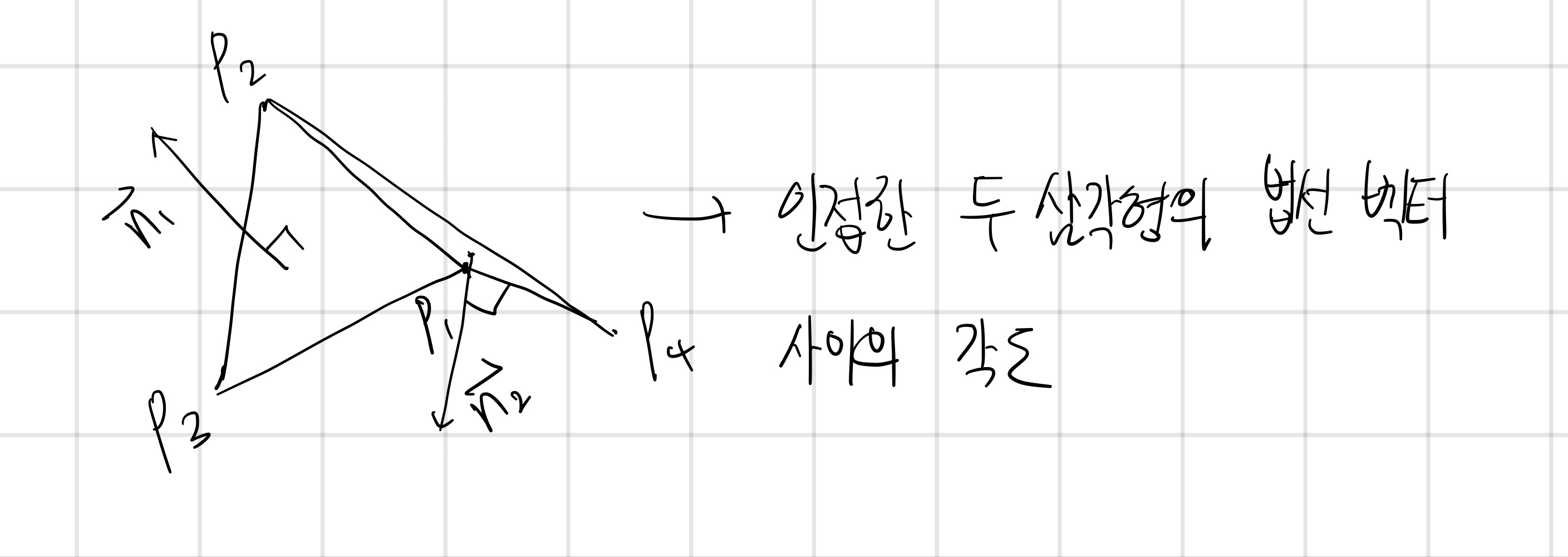 인접한 두 삼각형 $(p_1, p_3, p_2)$ 및 $(p_1, p_2, p_4)$ 에 대해 굽힘 제약을 생성한다. 이때 굽힘 제약 함수는 다음과 같이 표현된다: