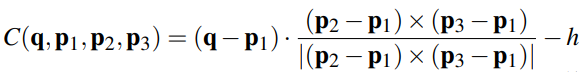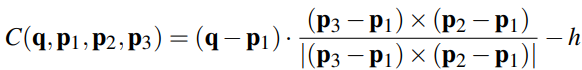 정점 $q$ 가 삼각형 $p_1, p_2, p_3$ 를 통과한다면 다음과 같은 제약 함수를 사용할 수 있다:
